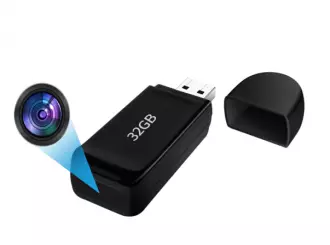Denna USB-kamera är en diskret spionkamera gömd i en USB-sticka. Den har Full HD-upplösning (1080p), 32 GB inbyggt minne, mikrofon och rörelsedetektering för dold inspelning.